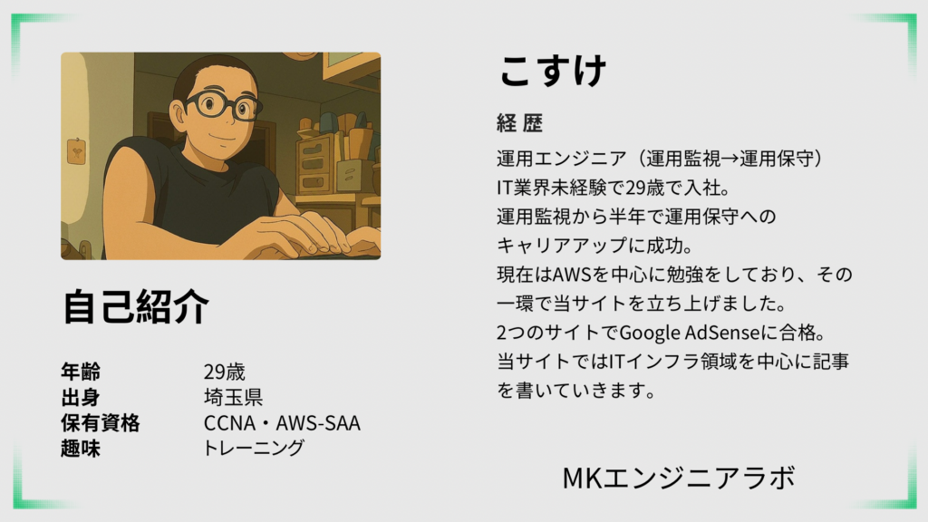 ホーム 2025.12.142026.04.09 新着記事 CCNAの難易度を偏差値で徹底解説!合格に必要なレベルは? 2026.04.13 LightsailでWordPressを構築してみよう! 2026.04.12 運用監視からのキャリアアップ戦略! 2026.04.11 1回で合格!AWS-SAAの勉強法を解説! 2026.04.09 AWS12冠とは?AWS概要からAWS12冠に掛かる費用を解説! 2026.04.07 記事一覧はこちらから 人気記事 運用監視オペレーターはやめとけ!リアルな現場の声と現実を解説 2026.01.082026.04.06 CCNA合格体験記!合格までに費やした時間と勉強方法を解説! 2025.12.152026.04.06 CCNA合格の近道?9tutとは何?リスクや的中率や購入方法を解説! 2025.12.172026.04.06 おすすめ AWS-SAA 単語帳AWS-SAA単語帳先日、AWS-SAA試験に合格しました。Ping-tやudemyなどの模擬試験を解いていて感じたのは「単語を覚える必要がある」でした。各サービスの説明は長く複雑で、実務をする上では覚える必要がありますが問題を解く上では簡... AWS LightsailでWordPressを構築してみよう! 2026.04.12 1回で合格!AWS-SAAの勉強法を解説! 2026.04.09 AWS12冠とは?AWS概要からAWS12冠に掛かる費用を解説! 2026.04.07 もっと読む CCNA CCNAの難易度を偏差値で徹底解説!合格に必要なレベルは? 2026.04.13 CCNAは意味がない?CCNAが活かせる現場と活かせない現場を解説! 2026.02.072026.04.06 CCNA学習におすすめの参考書をご紹介! 2026.01.262026.04.06 もっと読む LPIC LPIC-Level1の学習におすすめなサイトを解説! 2026.04.07 LPIC・LinuCの違いを徹底解説!受けるのはどちらがいい? 2026.01.072026.04.06 もっと読む プロフィール こすけ@AWSエンジニアになりたい 29歳で夢だった仕事を辞めて2025年10月にIT業界に転職。AWSを中心に日々の学び、積み上げて来たこと、経験してきたことを発信させて頂くブログです。 発信内容 AWSについて CCNAについて LPICについて 転職活動について 保有資格 AWS-SAA CCNA 氏名 メールアドレス 題名 メッセージ本文 (任意) Δ